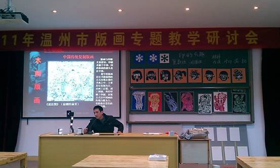 继教学研讨活动之后的专家讲座辅导成了这次活动关注点。市美术家协会副主席、版画艺委会主任、全国版画金奖得主温大陈旭海老师受邀,特别针对本次活动做了《木刻版画》的专题讲座,内容包含了版画的概况、黑白木刻的形式语言、制作工序等,并毫无保留地进行了现场制板、绘稿、刻版、印制四道工序的全程示范,让与会老师对版画艺术的创作了解更加系统、深刻而直观,认为大受启发,大大激发了与会教师的版画创作兴趣和热情。讲座过后,各地中小学美术教师有备而来,积极参与了市学校美术特色教研实践基地的咨询和预申报。
