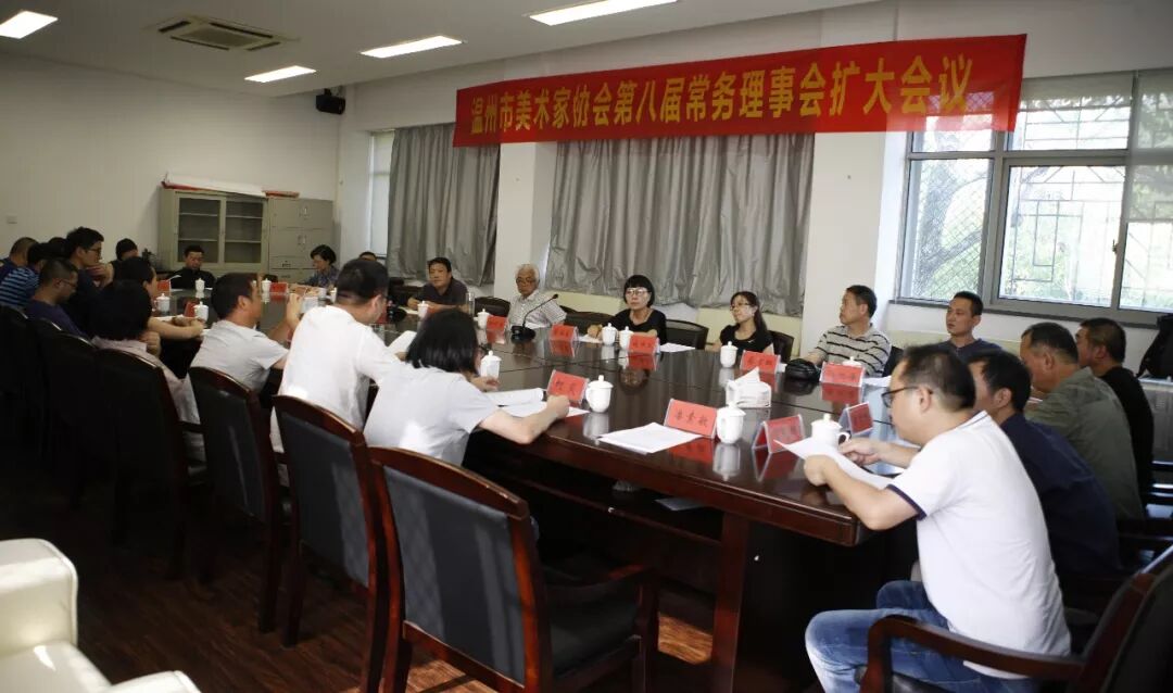 2018年7月27日下午,温州市美术家协会第八届常务理事会扩大会议在温州书画院召开。温州市文联副主席谢子康、温州市文联组联部主任施梓凤,温州市美协主席蔡瑞蓉、温州市美协名誉主席戴宏海、副主席兼秘书长张成毕、副主席张真恺、陈旭海、蔡可群和美协第八届常务理事、市美协副秘书长、市美协艺委会秘书长及各县市区美协负责人出席。温州书画院院长郑方伟列席会议。